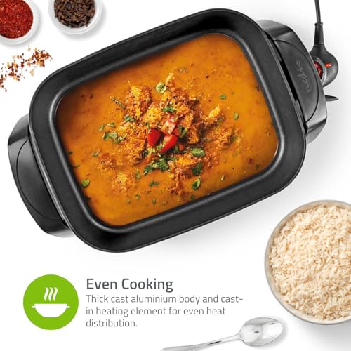 • DURABLE AND SAFE DESIGN – The tempered glass lid (with steam vent) and cool touch knobs and handles make it easy to transport the pan safely from one place to another even immediately after cooking. The thick cast aluminium body with cast-in heating element enables exceptional heat distribution throughout the entire cooking surface. Ideal for dinner parties, or everyday cooking.