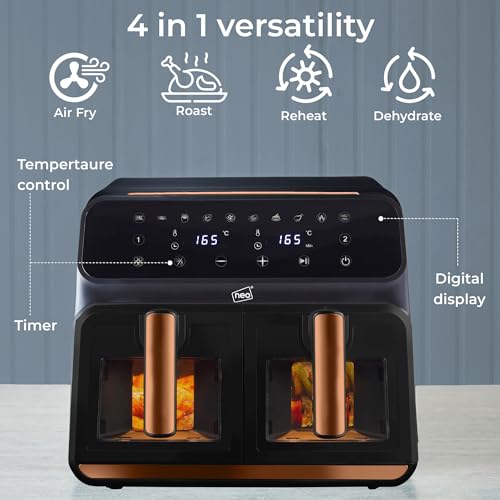Neo Black Copper Gold Dual Twin Zone Double Drawer Glass Window Electric Air Fryer 8.5L Digital Kitchen Grill Oven 1700W for Healthy Oil-Free Cooking