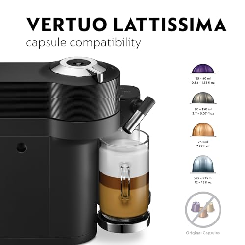 Nespresso Vertuo Lattissima Coffee Machine by De'Longhi for Vertuo Coffee Pods, Latte, Cappuccino, Integrated Milk Frother, Starter Capsule Set Included, ENV300.B, Black