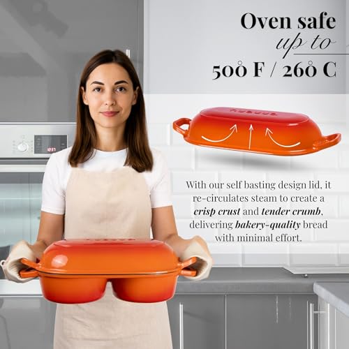 nuovva Dutch Oven for Sourdough Bread Baking – Enamelled Cast Iron Bread Loaf Pot – 500°F Oven Safe Non Stick Bread Pot – Double Round Loaf Space, 16.5cm Diameter, Orange
