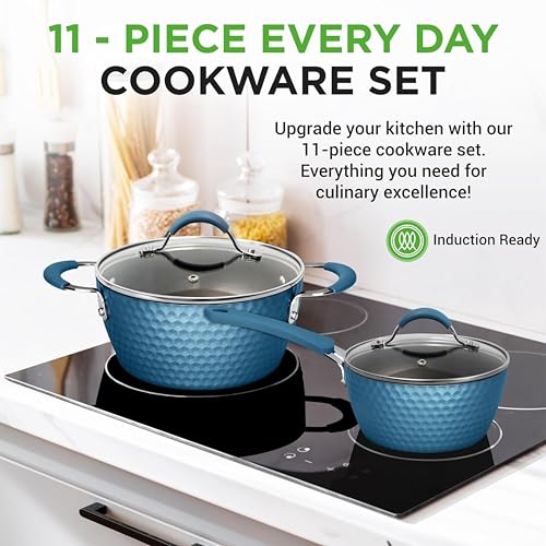NutriChef 11 Pc Pots and Pans Set Non Stick Cookware with Ceramic Coating, Ergonomic Handles, Induction Ready, Includes Saucepan, Dutch Oven, Large & Small Fry Pans, Royal Blue
