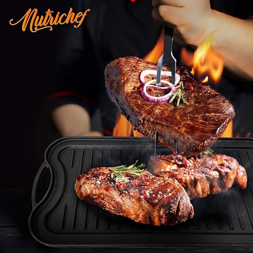 Nutrichef Reversible Cast Iron Griddle Pan – 50.7cm x 25.7cm, Non-Stick Flat and Ridged Grill Pan for Hob/Oven/BBQ, Induction and Gas Safe, PFOA & PFOS Free, Includes Scraper- Black