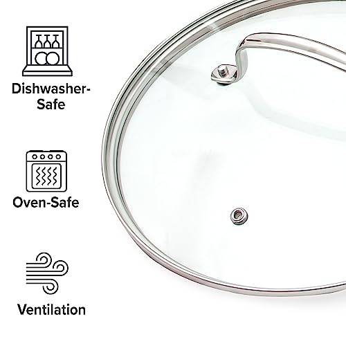 - PREMIUM TEMPERED GLASS LIDS – The premium shatter-resistant lids included with this set include a small ventilation opening to ensure steam is released safely while you’re cooking. Plus, they are oven safe up to 350°F and dishwasher safe.