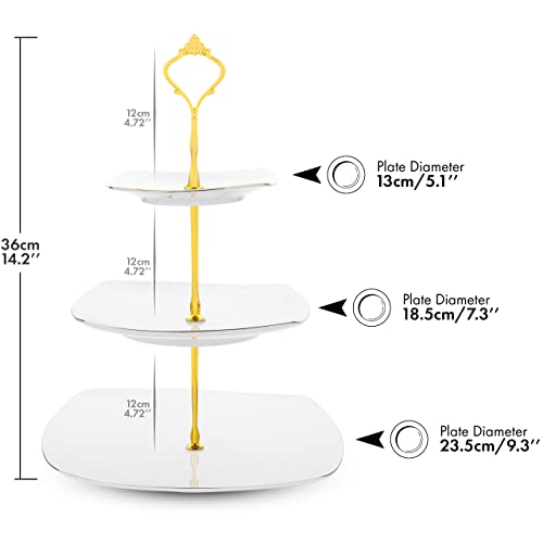 - WHAT’s IN OFFER – Beautiful 3 tier Square ceramic cupcake stand with new design and great looking Gold fittings. Having successfully passed all food safety standards, these porcelain three tier cake stands are perfectly designed to present your delicious homemade cupcakes, desserts, appetizers as well as fruits etc and act as centre piece for your table or dining room. With its flawless and authentic design, these are very simple to assemble and dissembled for space saving.