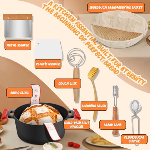- Everything You Need: The pre-seasoned 10inch/ 26cm oven comes with everything you need for sourdough baking including a bread preheating basket, silicon bead sling, scribing cribs, dough whisk, double handles and more …… Oven care booklet and owner's manual are also included.
