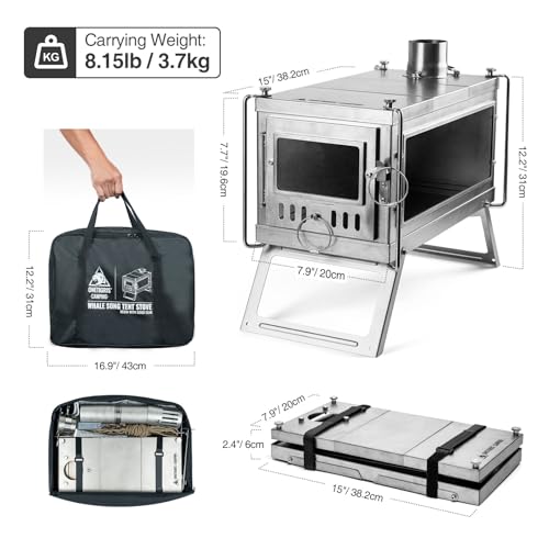 - Easy Assembly: With a fold-out base, foldable legs, and interlocking panels, the stove is quick to assemble. Four C-shaped lockLarge Firewood Door: Bigger firewood openings for adding firewood. 15” by 7.9” by 7.7” in size after setup, with a firebox volume of 14.97L, keeps you warm the whole night in a tent.s secure the structure, a design that’s patented for both functionality and appearance