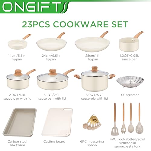 ONGIFT 23 Pcs Pots and Pans Set Nonstick, Kitchen Cookware Sets, with Frying Pan, Saucepan, Saute Pan, Lightweight Cooking Set with Stay-Cool Wood Print Handles, NO PFAS and PFOA, Light Wood