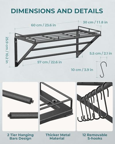 OROPY Wall Mount Pot Pan Racks, Saucepan Hanging Rack, Kitchen Utensils Hanging Shelf with 2 Rails, 12 Hooks, 60cm