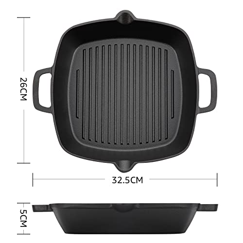 OVERMONT Cast Iron Grill Pan with Handle – Cast Iron Pan Square 26 cm – Pre-Burned Steak Pans Frying Pan – Cast Iron Pan for Gas Grill Oven Charcoal Grill