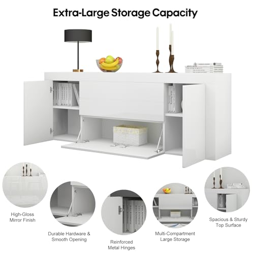 Panana Living Room Large Sideboard Cabinet High Gloss Front and Top Chest of Drawers 2 Door 2 Drawer 2 Flap Storage Cupboard W200xD35xH72cm (White)
