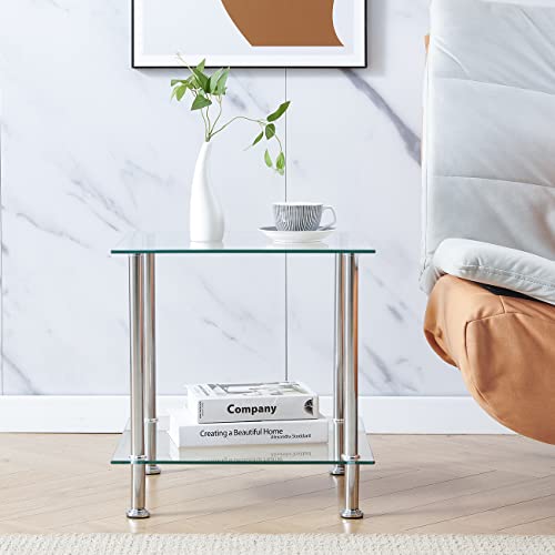 Pantanal Glass Sofa Table Side Table Small with Storage Shelf, Living Room 2 Tiers Corner Coffee End Table Bedroom Little Nightstand Beside Table (Clear, Square)