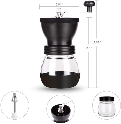 • 【Features】PARACITY manual coffee grinder comes with two clear glass jars, convenient to keep powders or beans during outdoors. Silicone lid is soft to touch and convenient to add beans. Nonslip silicone base keeps the coffee mill in place during grinding.