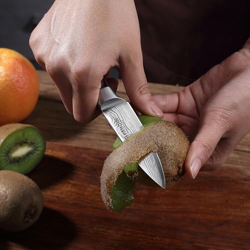 PAUDIN 3 Pcs kitchen knife sets includes 8″ chef knife is suitable for most kitchen cutting works. 7″ santoku knife is better for fish and meat. And 3.5″ paring knife for smaller vegetables and fruits
