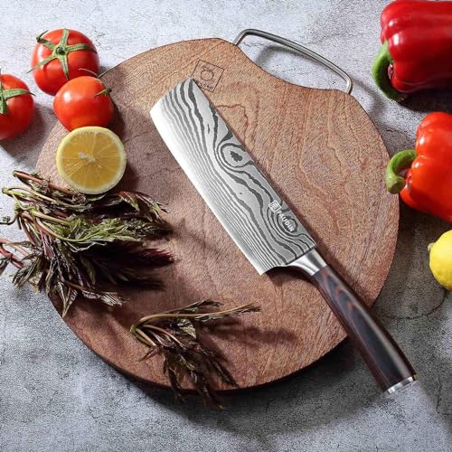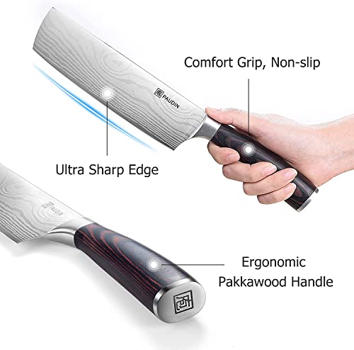 - High-Quality Stainless Steel: Professional Japanese kitchen knife durable to use. The Paudin nakiri kinfe is made of 5Cr15Mov stainless steel (not real Damascus) with 56+ hardness which can well resists rust,corrosion and discoloration.