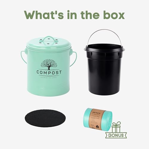 Perfnique Kitchen Compost Bin, 1.3 Gallon Countertop Compost Bin with Lid, Indoor Compost Bucket Includes Inner Bucket Liner and Carbon Filter, Small Compost Bin with Trash Bags (with Bags, Mint)