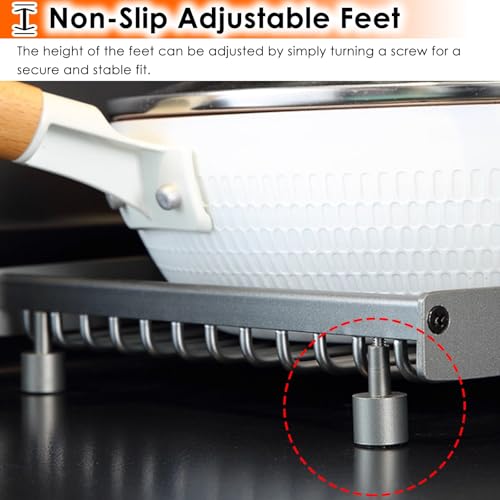 - Home Cookware Organization : Designed for kitchen organization, this pot organizer rack securely holds cast iron pots, frying pans, skillets, sauce pots, shallow cookware, and bakeware. It can be placed on countertops, floors, corners, or inside cabinets, enhancing the aesthetics of your pantry or kitchen stovetop
