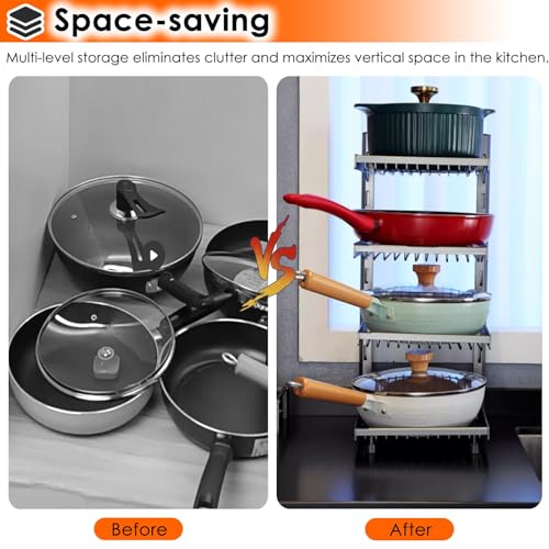 - Space Saving Kitchen Storage : Compared to stacked cookware, our multi-layer pot rack takes up some storage space compared to stacking pots, it helps de-clutter your cabinets, making it easier to access, view, and organize pots, and making the most of your closet's vertical space