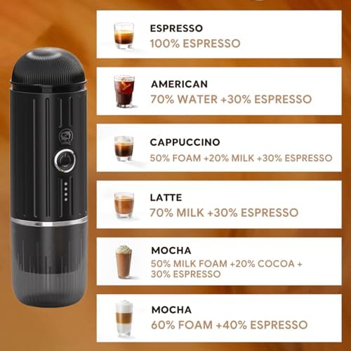 - PORTABLE & COMPACT DESIGN Lightweight mini espresso machine with a compact body that easily fits into backpacks, suitcases or car cup holders.