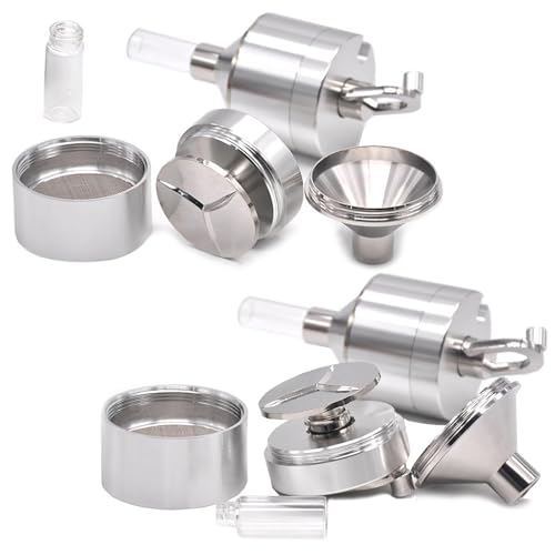 - ★ The middle section includes a built-in mesh for filtration; at the bottom lies a funnel to collect powdered spices into the glass bottle.