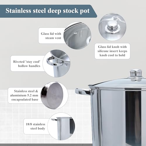 Buckingham Deep Induction Stock Pot with Glass Lid Premium Stainless Steel Multipurpose Large Cooking Pot for Soups Stews 26 Cm 11 Litre