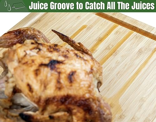 - Keeps Kitchen Clean. One of the standout features of our Carving Board is its innovative juice groove. Strategically carved along the edges, this groove collects and contains the natural juices from your meats, preventing any mess and making it easier to pour or spoon out for sauces, gravies, or basting. Say goodbye to messy countertops and hello to convenience!
