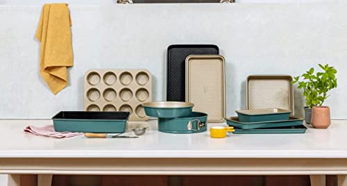The Prestige x Nadiya bakeware range comes with a beautiful teal non stick exterior, with roasting tins featuring a black interior and cake tins featuring a gold interior