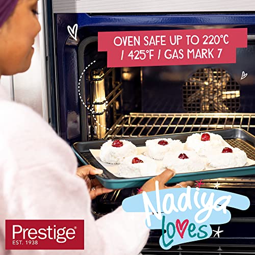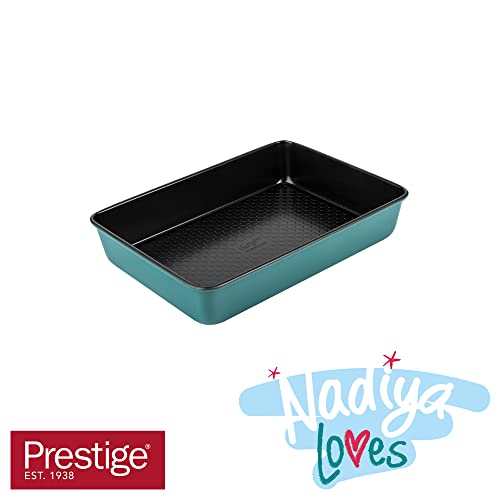 - VIBRANT TEAL EXTERIOR – The Prestige x Nadiya bakeware range comes with a beautiful teal non stick exterior, with roasting tins featuring a black interior and cake tins featuring a gold interior