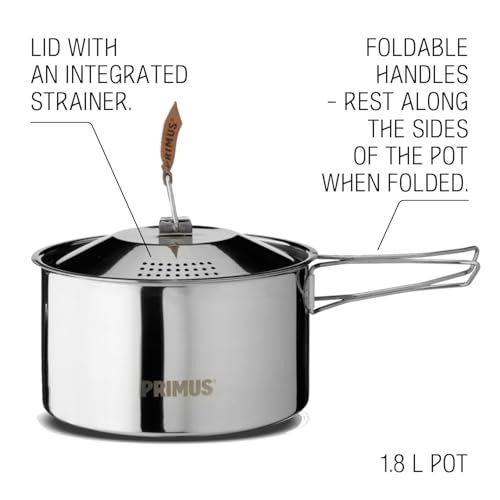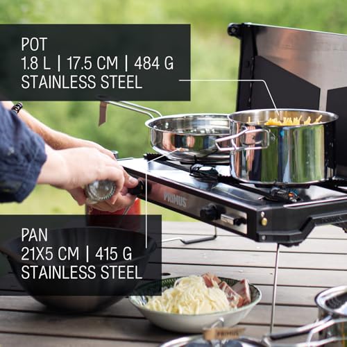 Primus Camping Cookware Set – Campfire Cookset Stainless Steel Small – 1,8 L and 17,5 cm Camping Pot and 21 cm Camping Pan – Camping Pots and Pans for Gas Stove or Open Fire – Camp Kitchen Equipment