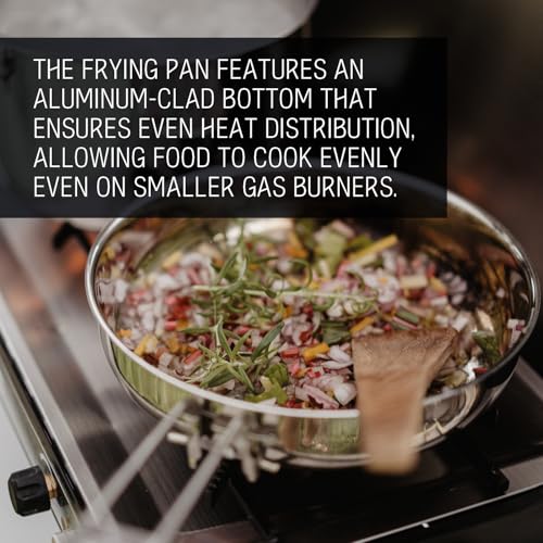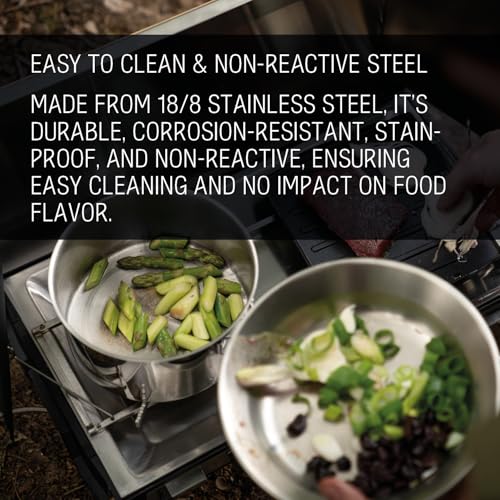 • EASY TO CLEAN & NON-REACTIVE STEEL – 18/8 stainless steel is durable, non-reactive, and easy to clean, making it ideal for cooking equipment. It resists corrosion and stains, and it won’t affect the flavor of your food. It also withstand high temperatures, making it suitable not only for camping and gas kitchens but also for cooking over an open fire.
