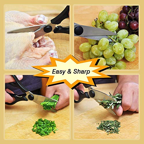 - 1. Multi-purpose Sharp Scissors: Poultry scissors for chicken, poultry, fish, meat, vegetables, herbs and small bones. No need for a knife and board, shred cooked meat, trim fat and dice raw meat.