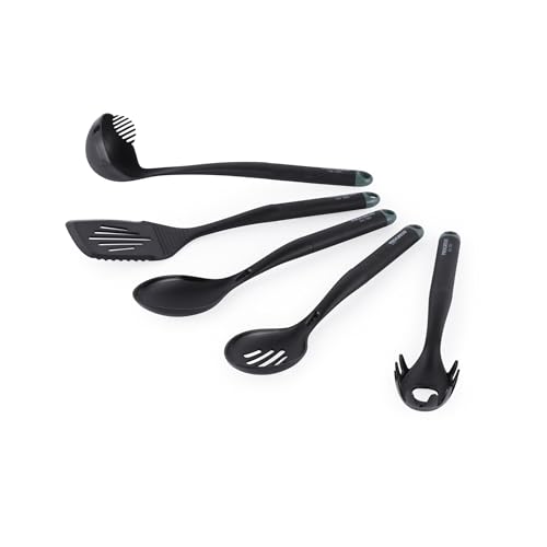 - Sleek black with a shimmering green trim, this spaghetti spoon looks fantastic in any environment and includes a hanging loop for effortless storage.