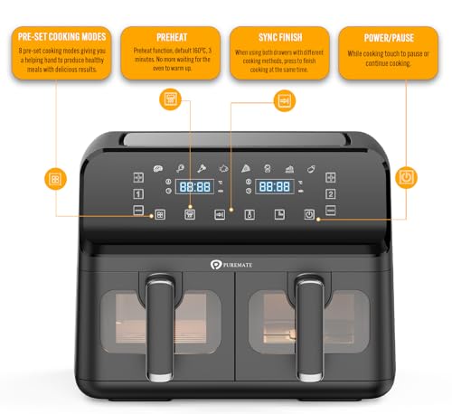 PureMate 9L Dual Air Fryer with Digital Display, Healthy Oil Free 2500W Air Fryer with 8 Preset, LED One Touch Screen, Timer & Adjustable Temperature Control (9L(4.5L+4.5L) Dual Basket)