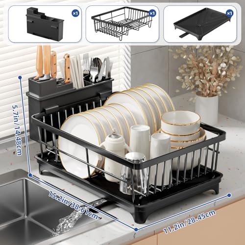 PurKeep Dish Drainer Rack – Space-Saving Dish Rack with Utensil Holder for Kitchen Counter, Large Capacity Dish Drying Rack with Draining Board, Black