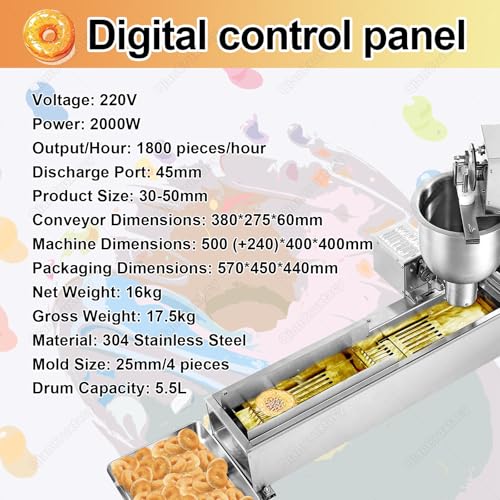 • ✔【Efficient and Fully Automatic Production】Donut maker machine integrates frying, dripping, frying, automatic flipping, collection, and counting, achieving highly automated o peration. Equipped with a 5.5-liter hopper and four donut molds, it can produce up to 1,750 donuts per hour, effectively meeting peak demand and improving production efficiency