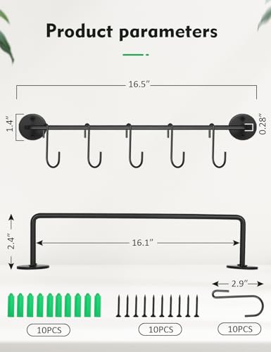 • Size & Easy installation: 2 * black hanging rod (16.7" L x 2.37" H) , 10 * mug hooks(55mm). Come with essential mounting gagets, easy to mount to the wall or under cabinet.