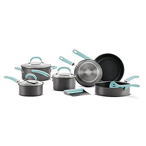 Rachael Ray 81125 11-Piece Hard Anodized Aluminum Cookware Set, Gray with Light Blue Handles