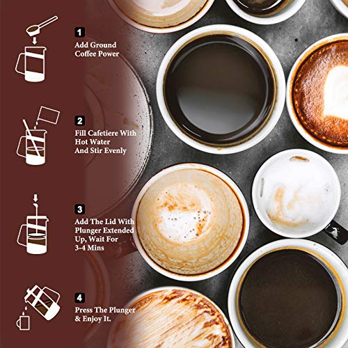 - French press coffee pot allows you to brew coffee of pure and strong flavor.