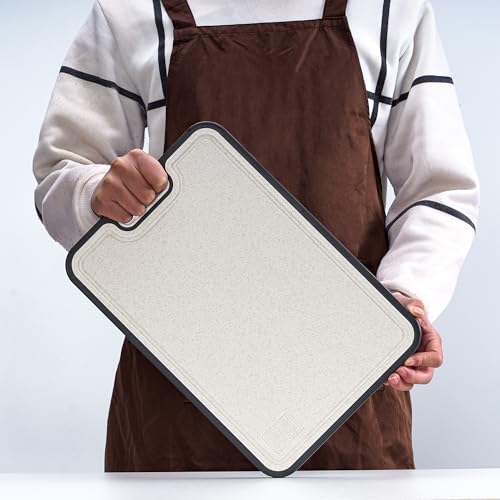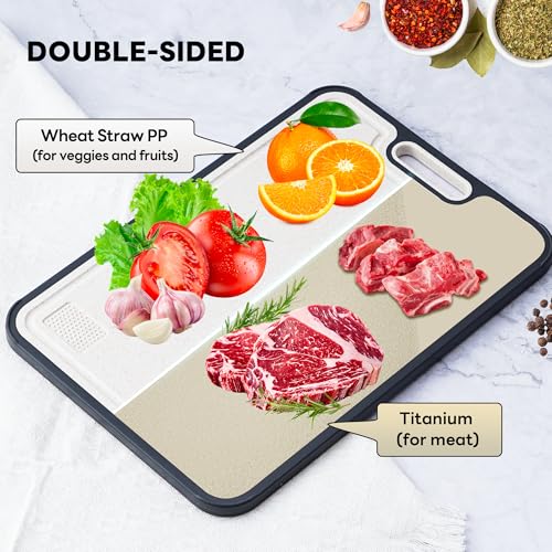 • 【Dual-Sided Convenience】Champagne-toned titanium for meats & poultry; eco wheat-straw side for fruit & veggies. Flip once to keep flavors distinct and everyday prep effortless—no extra boards, less counter clutter.