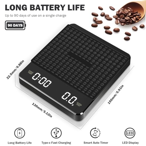 - Eco-Friendly USB-C Charging: This mini coffee scale includes a 400mAh rechargeable battery with Type-C fast charging. No disposable batteries needed—fully charges in 4 hours for 30+ days of regular use, ideal for home and professional setups
