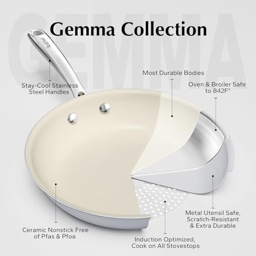 • COOL & STURDY HANDLE: Crafted from lightweight, precision-pressed stainless steel, this ergonomically designed handle ensures a comfortable grip. Double-riveted for exceptional strength and maneuverability, the ceramic skillet pan empowers you to seamlessly transition from stovetop to oven, allowing you to achieve that flawless sear, brown toppings, or even bake