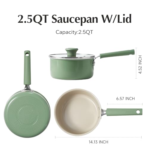 Redchef Ceramic Nonstick Saucepan with Lid,18cm Small Cooking Pot, Non Toxic Sauce Pans for Kitchen, Cool Handle PFAS Free Compatible with All Cooktops, Green