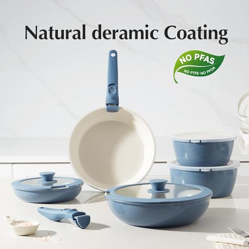 Redchef Ceramic Pots and Pans Set Non Stick, 16 pcs Nonstick Cookware Set with Detachable Handle, Non Toxic, PFAS PFOA & PTFE Free, RV Ceramic Cookware Set for Camping, Oven Safe (Blue)