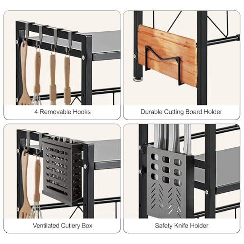 - Included Accessories: Enhance organization with 4 functional hanging hooks, a sliding utensil holder, a safe knife storage cradle, and a drainage slat for your cutting board. The comprehensive set provides multifunctional solutions to keep tools, ingredients, and appliances neatly separated and readily accessible