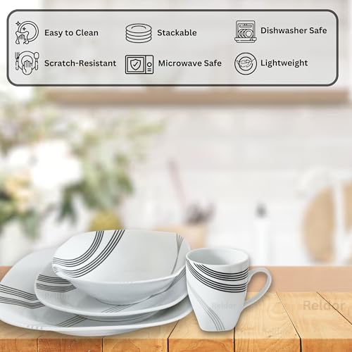 - Reldor 16-Piece Dinner Set with Square Bowls: This 16-piece dinnerware set from Reldor includes 4 dinner plates, 4 side plates, 4 bowls, and 4 mugs, making it perfect for serving breakfast, lunch, dinner, sides, desserts, and drinks. Use the set as a whole or individually, with each piece designed to make serving easy and elegant with wide edges, handles, and a beautiful Black Grey Stripe design. This plates and bowls set is ideal for everyday use and gifting.