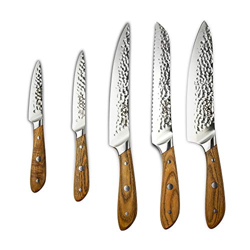 - HAMMERED BLADE FINISH – Not only does this provide a traditional looking effect on the knife blade, it also prevents the blade from sticking while preparing food!