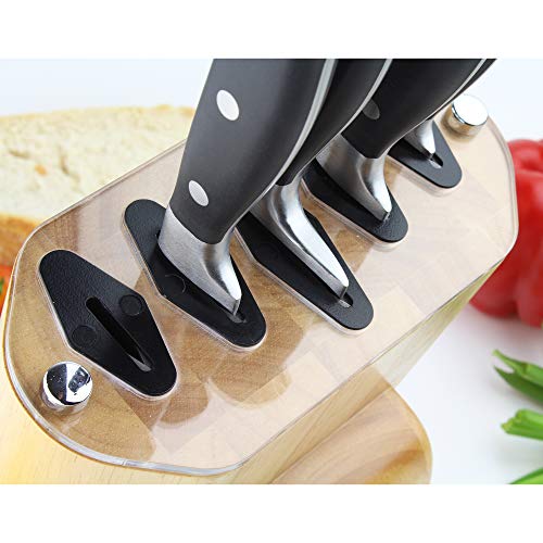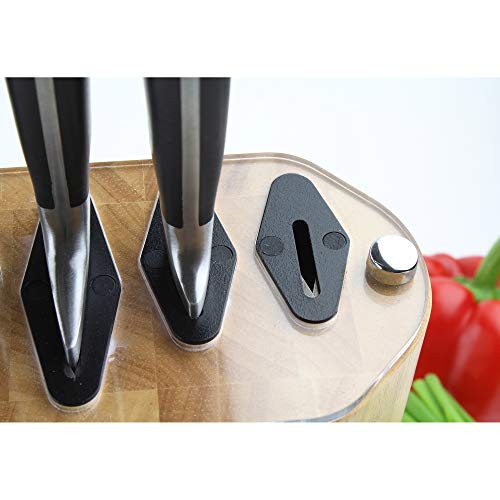 - Featuring integrated sharpening steels in each knife slot, which hone straight knife edges each time they are removed and placed back into the block (bread knife slot does not contain a sharpener)