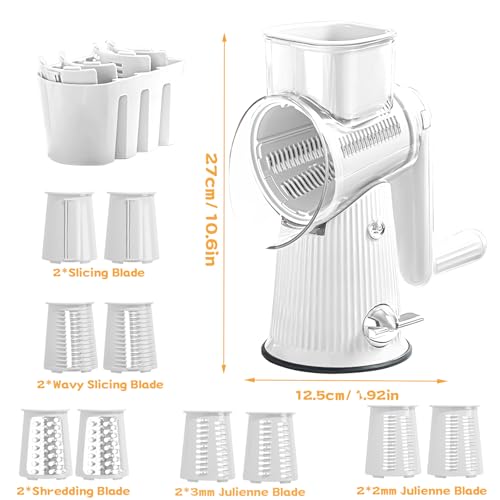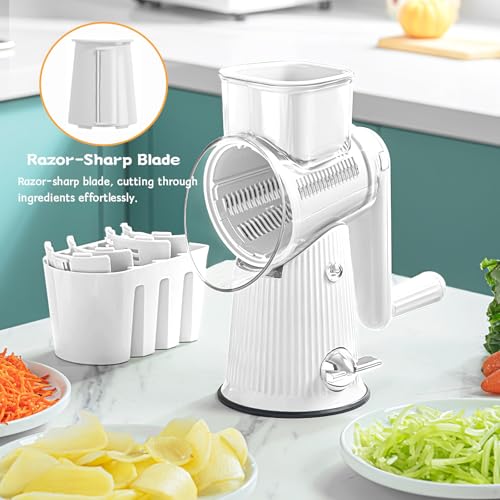 Rotary Cheese Grater for Kitchen, 5-in-1 Multifunctional Vegetable Slicer with Handle and Strong Suction Base, Round Mandoline Slicer & Food Chopper for Vegetables, Fruit, Cheese (White)