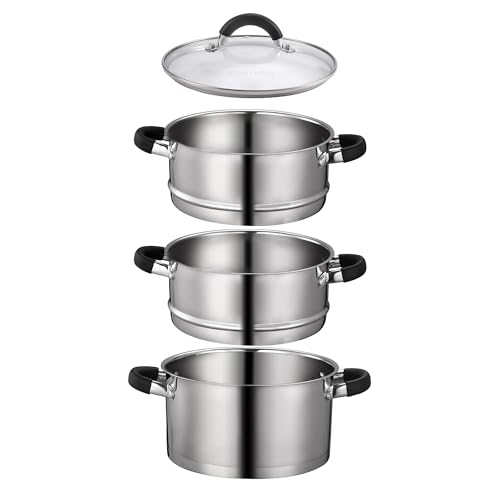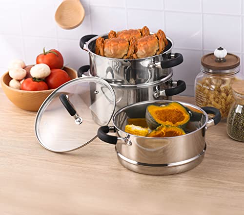 Royal Cuisine 3 Tier Stainless Steel Steamer Cooking Pot 22cm Multi Layer Pan with Glass Lid Stackable Veg Steamer Food for Vegetables Induction Cookware with Silicone Handles