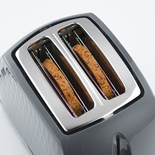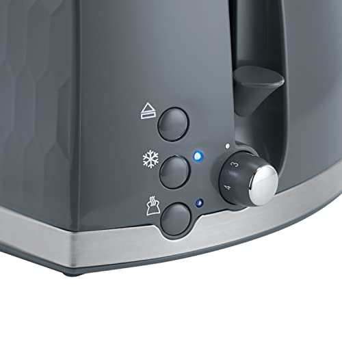 - Textured Design – The Honeycomb 2 Slice Grey Toaster has a Textured Design with Stainless Steel Accents, that makes a statement on any kitchen counter
