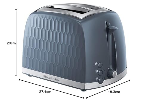 Russell Hobbs Honeycomb 2 Slice Toaster (Extra wide slots, High lift feature, 6 Browning levels, Frozen/Cancel/Reheat function, Removable crumb tray, 850W, Grey textured high gloss) 26063
